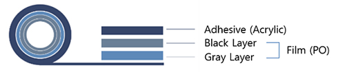 白色PVC材料フィルムとアクリル系接着剤で構成されている表面保護用粘着テープです。